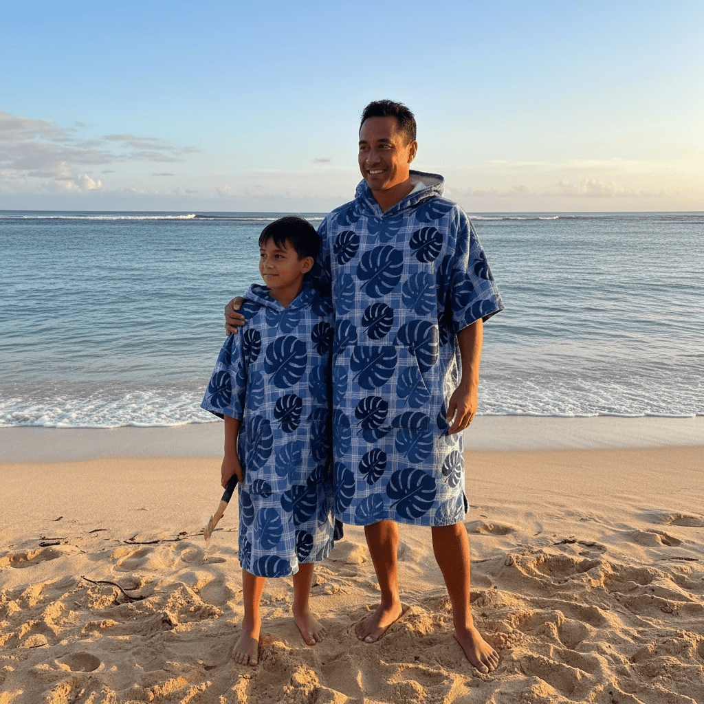 Adult Blue Monstera Palaka Hooded Towel - Sweet Sweet Honey Hawaii